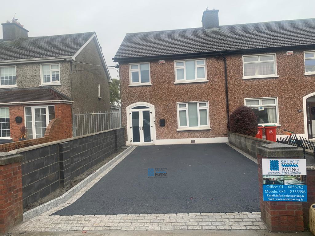 This is a new asphalt driveway that Select Paving completed in Blanchardstown, Dublin. The driveway also features a new wall with pillars on the left-hand side and natural granite cobblestones for the borderline and apron.