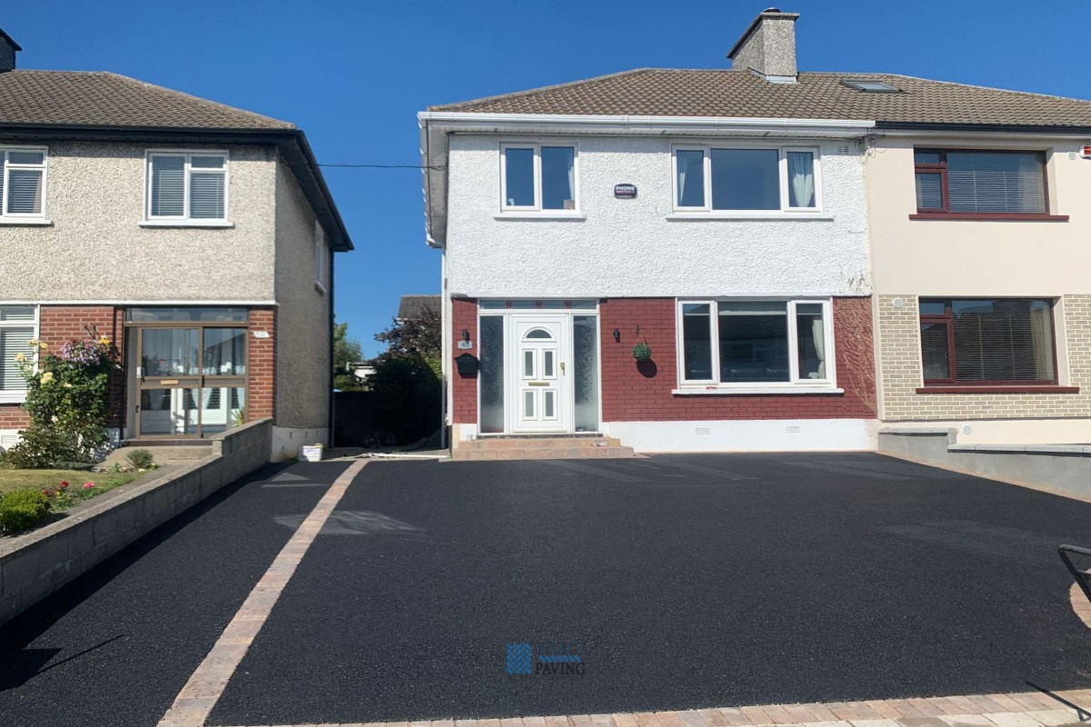 This driveway project, installed by Select Paving in Beaumont, Dublin, features an asphalt top finish with rustic cobblestone borderline, two new steps and raised flowerbeds on the right-hand side.