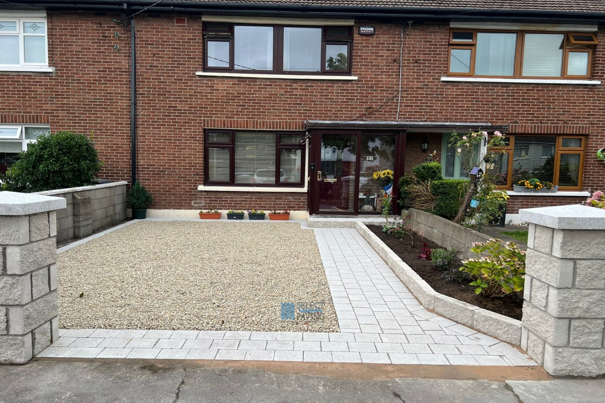 Select Paving installed a new driveway in Beaumont, Dublin, featuring a gravel top surface with a granite pathway and apron, two new brick pillars at the entrance and raised flowerbeds on the right-hand side.