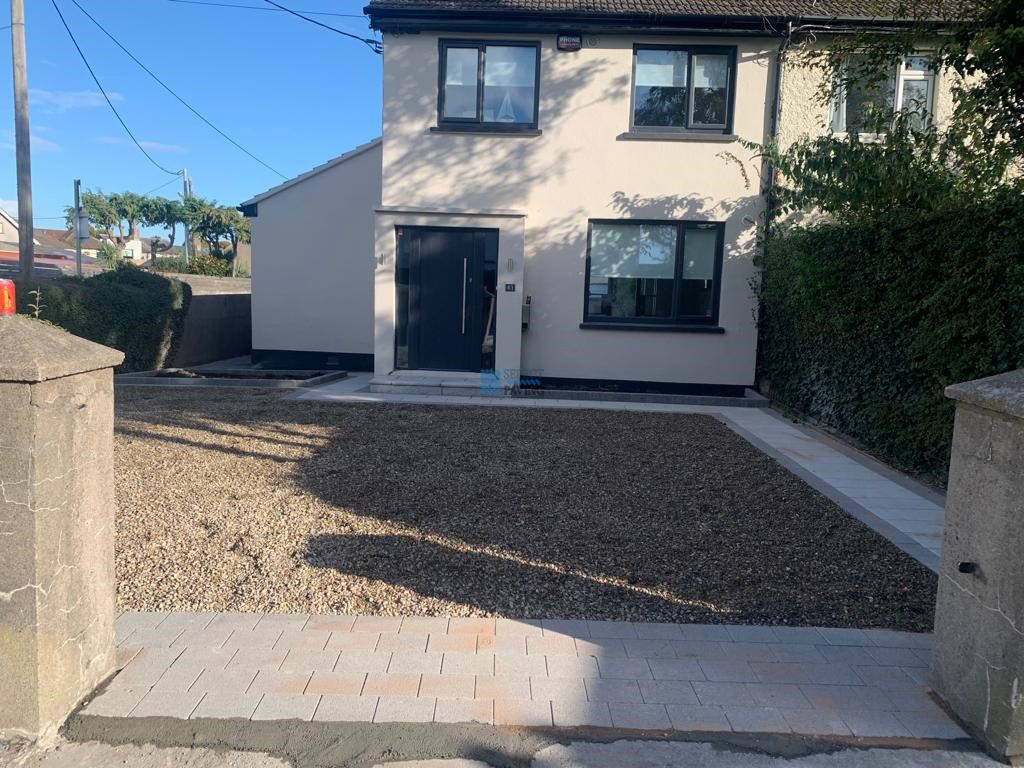 Select Paving installed a new, gravelled driveway in Clontarf, Dublin. It features yellow beach pebbles and a granite slabbed pathway, apron and doorstep.