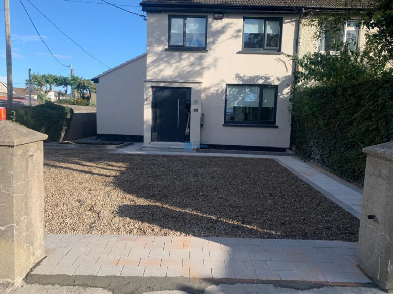 Here is a block paved driveway installation by Select Paving, the number one driveway and patio specialist for Dublin. We replaced the old driveway and extended the entire area. Put in a new base foundation and added a small flower bed which we retained with a block kerb. The driveway was laid with a natural stone Corrib block from Kilsaran, and the border is done with a granite Corrib style.