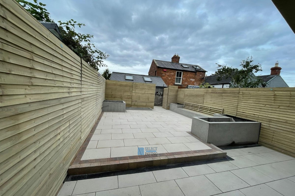 Select Paving installed a new patio in Ranelagh, Dublin. The project features Kilsaran granite flagstones, new panel fencing, and boxed and rendered flower beds with an inbuilt bench.