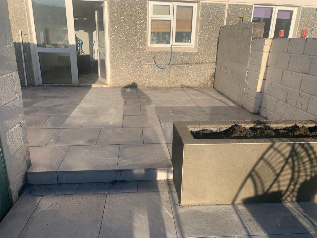 This stunning patio transformation features square porcelain tiles with a tiered layout and boxed flowerbeds. The project took place in Rathfarnham, Dublin.
