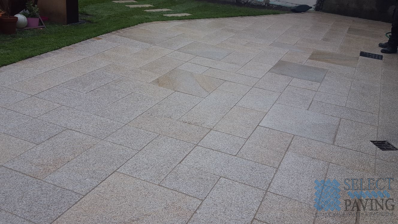The slabbing flagstone used was a granite 3-size mix, coloured in a Gold finish from Kilsaran.