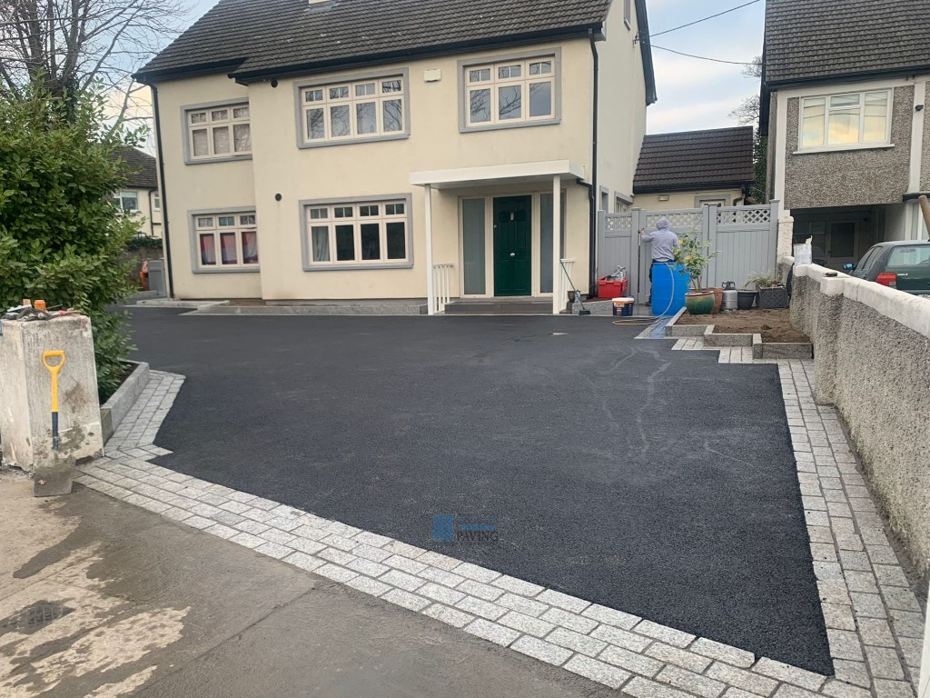 At the front of the house, we installed a new tarmac driveway. We dug out the original surface and laid a new hardcore foundation. We enclosed the tarmac with granite kerbing and granite cobblestones around the perimeter. We created raised flowerbeds with fresh topsoil.